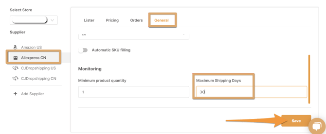 Path: Settings → Supplier Settings → AliExpress → Maximum shipping days