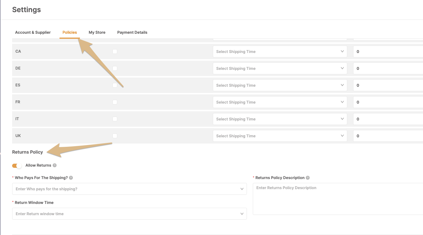 - Who pays for the shipping-select the payee for the returned product shipping fee (customer/supplier)
