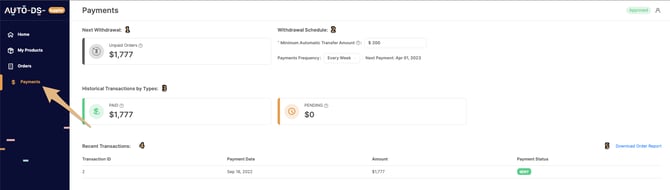 - Paid orders → Amount already transferred to your bank account. - Pending → Amount currently being processed by AutoDS finance. (Does not include the next withdrawal amount.) |